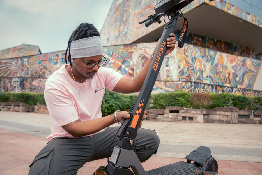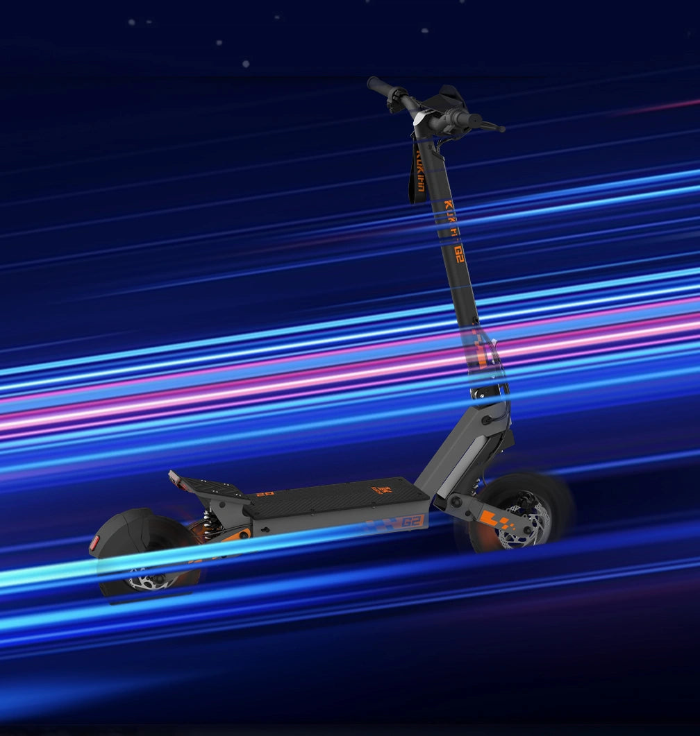 The KuKirin G2 features a quick one-touch folding system, letting you fold or unfold the scooter in just a few steps. Once folded, the front latch locks onto the rear plate to prevent accidental opening during transport. The compact mechanism is durable and tested for frequent use, ensuring safe, stable, and long-lasting convenience.