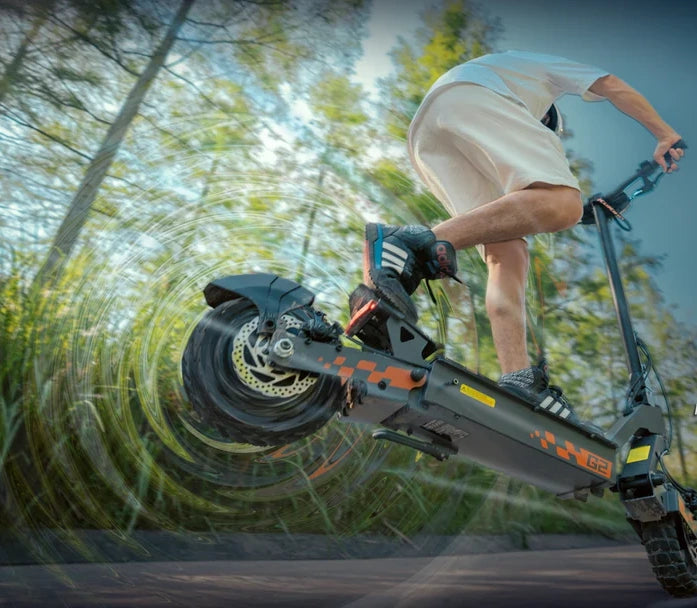 The KuKirin G2 uses front and rear disc brakes with power-off braking for fast response. Even at high speeds, it stops safely within 4–10 meters, giving you reliable braking in emergencies.