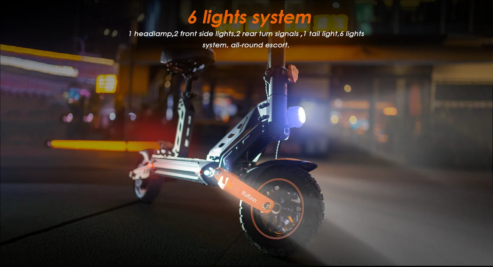 The KuKirin G2 Max is equipped with a complete LED lighting system, including front headlights, rear lights, turn signals, and brake lights. With six LEDs in total, it greatly enhances road visibility and ensures safer night riding with clear flashing signals for turning and braking.