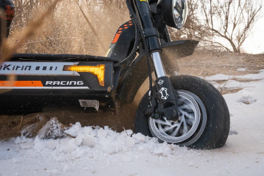 The 12-inch extra-wide off-road pneumatic tires feature a wider tread and rugged pattern for stronger grip, better traction, and superior shock absorption—reducing bumps and improving overall riding comfort.