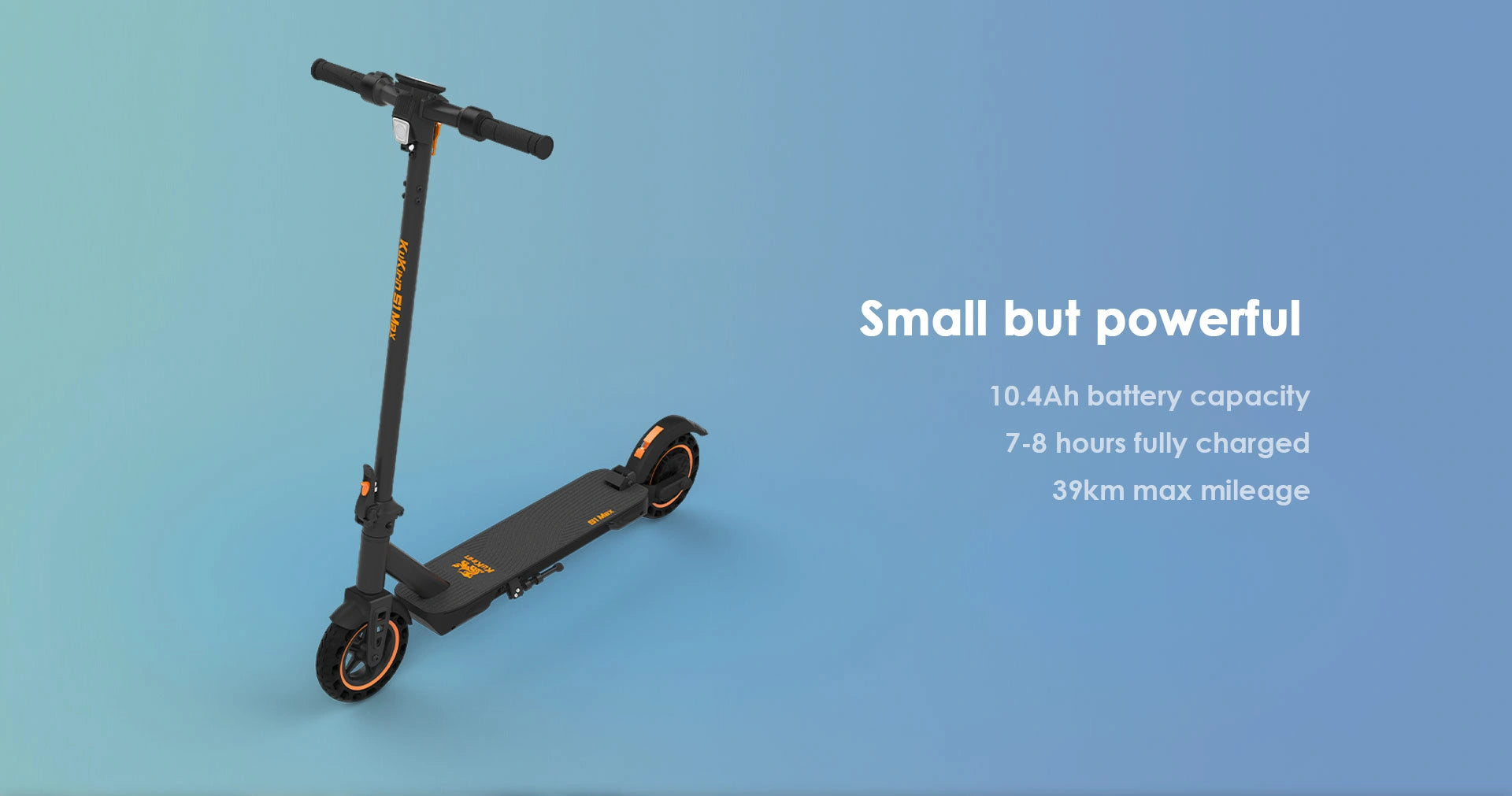 KuKirin S1 Max equipped with 36V10.4Ah high performance lithium batteries, with a range of up to 39 kilometers on a single charge, it meets your needs for a day's use, so you're always ready to go and say goodbye to mileage anxiety.